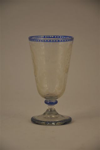 VERRE soufflé à pied en verre, paraison conique à décor gravé cynégétique, architecture, et motifs rocaille, filets bleus. Haut. 14,5 cm.
