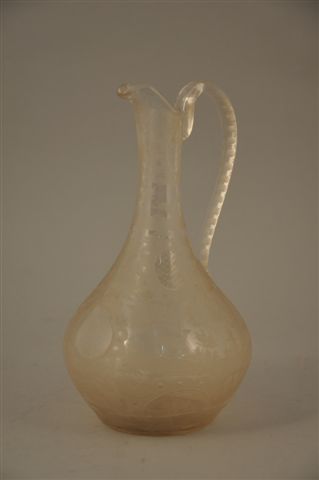 CARAFE pansue en verre soufflé incolore, le corps entièrement gravé à décor cynégétique dans des réserves, alternées de motifs rocaille, l'une formant cartouche, non chiffré, anse appliquée à chaud. XIXème. Haut. 23,5 cm (accident à la base de l'anse)