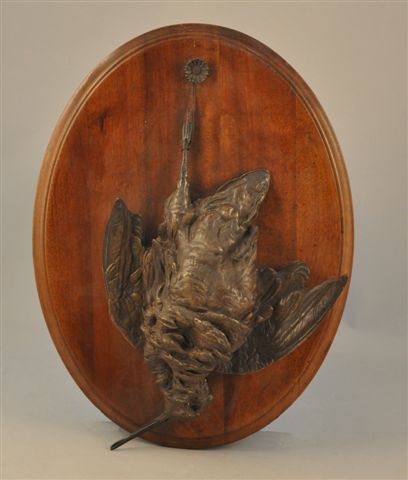 Deux SUJETS en régule patiné, représentant les trophées en ronde bosse d'une bécasse et d'un vanneau huppé, sur panneau ovale en noyer. XXème. 46,5 x 35 cm (accident et manque à une aile)