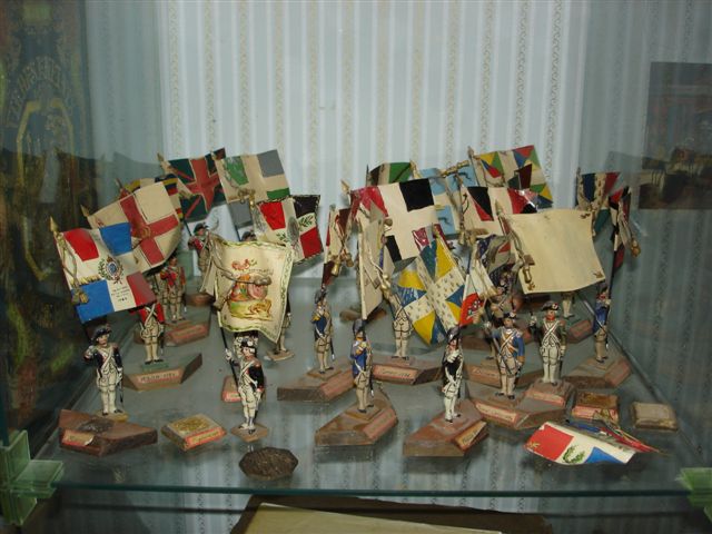 22 PORTE-DRAPEAUX en étain, peints à la main, de divers enseignes (principalement ancien Régime).