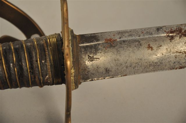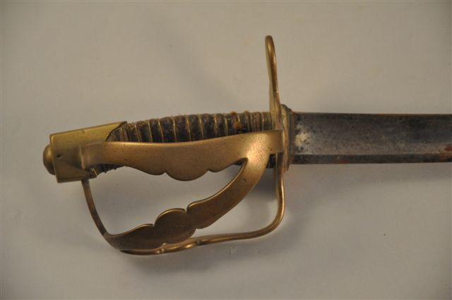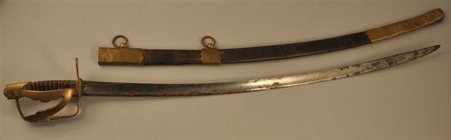 SABRE de chasseur à cheval mod. de 1790, garde en laiton trois branches, lame à dos et pan creux, marquée AP, poignée cuir et filigranne, avec virole, fourreau cuir et laiton à trois garnitures. Long. avec fourreau: 105 cm (usures à la poignée, lame oxydée, chocs aux garnitures, cuir perforé en partie médiane)