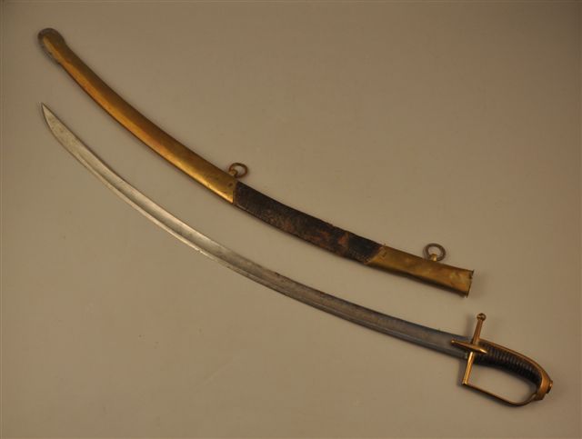SABRE réglementaire de hussard mod. an 4, garde en laiton à une seule branche, quillon et 2 oreillons, fusée recouverte de cuir, lame à pan creux et tranchant, sans marquage, fourreau cuir, 2 bélières, 2 garnitures en laiton et dard en fer, bon état général. Long avec fourreau: 104 cm. (fourreau en mauvais état, encoche au tranchant en partie médiane, piqûres, chocs aux garnitures)