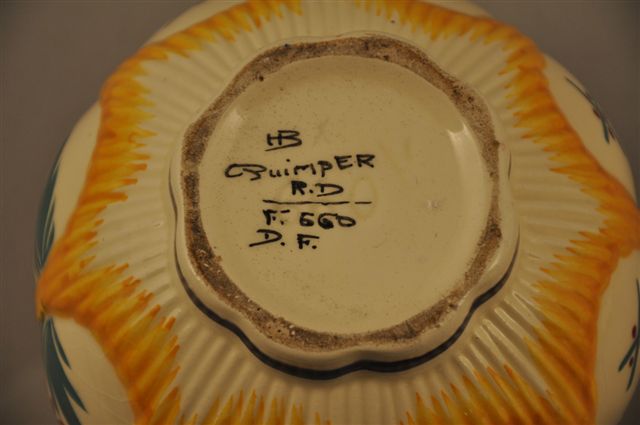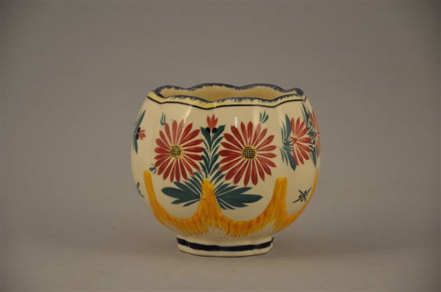 QUIMPER HB. VASE en faience fine à côtes melon à décor de fleurs peintes stylisées. Haut. 12, Diam. 15 cm.