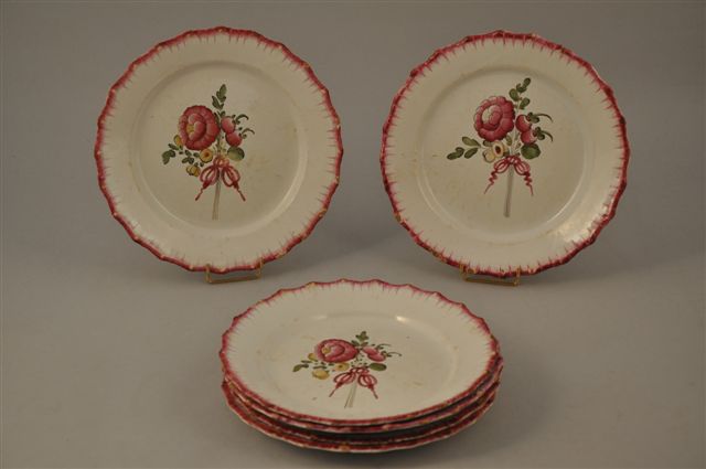 LES ISLETTES. SIX ASSIETTES en faïence polychrome, à décor floral. Bordure mouvementée soulignée par un pinceautage carmin sur fond crème. XVIIIème-XIXème.