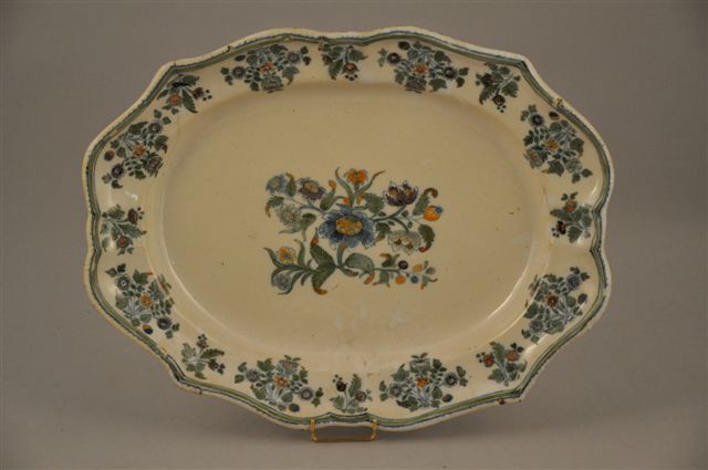 MOUSTIERS. PLAT ovale de forme mouvementée en faïence de grand feu à décor de bouquets de fleurs sur l'aile et au centre du bassin. XVIIIème siècle. Long. 39,5, Larg. 30,5 cm. (fêle avec restauration ancienne)