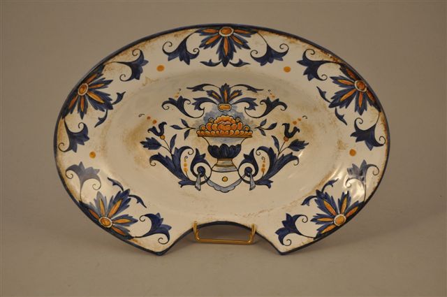 VARIA. PLAT à BARBE en faïence de grand feu décor végétal dans le goût du XVIIIème. Haut. 7, Larg. 27,5, Prof. 18,5 cm.
