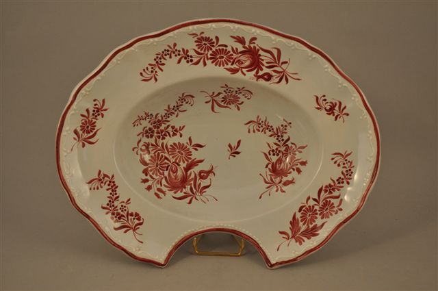 VARIA. PLAT à BARBE en faïence à décor de grand feu, orné de fleurs dans le goût du XVIIIème. Haut. 7,5, Larg. 25,5, Prof. 20 cm.