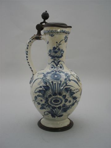 DELFT. GRAND POT À EAU CHAUDE sur piédouche en faïence de grand feu à décor bleu et blanc de bouquets fleuris, oiseaux et insectes. Monture en étain. XVIIIème. Haut. 38 cm. (accidents et restaurations)