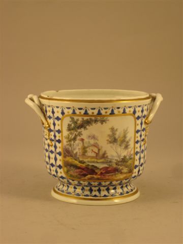 CHANTILLY. CACHE-POT sur piédouche en porcelaine blanche à décor de scènes champêtres dans des réserves sur fond de quadrillage bleu et or. Les anses agrafées de fleurettes. Porte au revers la marque de Chantilly et une étiquette: "cachepot à anses, décor quadrillé. Chantilly. pièce 800 f". . XIXème. Haut. 13, Diam. 13,5 cm. (éclats et accident)