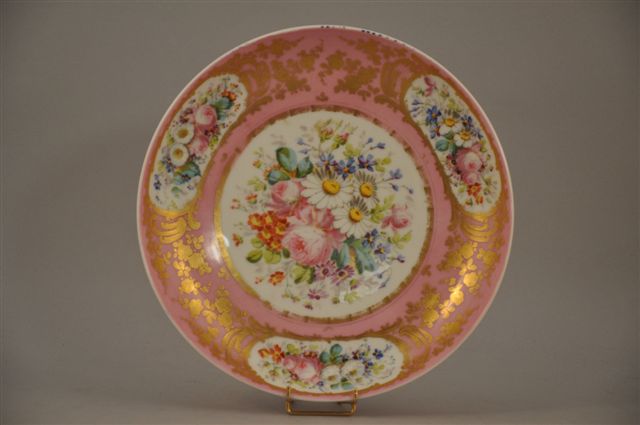 PARIS (dans le goût de). PLAT rond creux en porcelaine à décor floral dans des réserves, sur fond rose, rehauts dorés. Diam. 27 cm