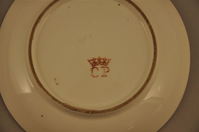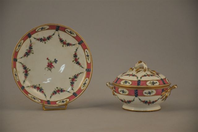 VARIA. BOUILLON COUVERT et son PLATEAU en porcelaine polychrome. Décor peint, dans des réserves ovales, de bleuets, alternées de rubans retenant des guirlandes de fleurs, sur bandeau de couleur rose. Filets dorés. Anses latérales et prise du couvercle branchés. Marqués au cachet CP avec couronne royale ouverte pour Manufacture du Faubourg Saint Denis de Charles Philippe, Comte d'Artois. Copie du XIXème.