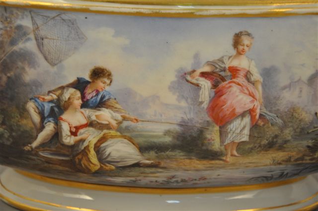 VARIA. GARNITURE de CHEMINÉE en porcelaine émaillée polychrome comprenant une JARDINIÈRE et une PAIRE DE CACHE-POTS. Décor de paysages et de scènes galantes inspirées de la Renaissance et du Siècle des Lumières. Signée G. POITEVIN. XIXème.