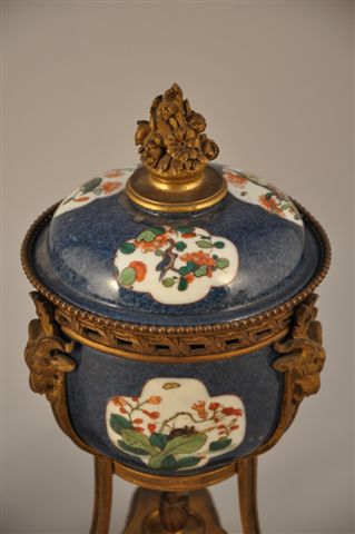 Montés en brûle parfum. La monture en bronze doré composée d'une base trilobée reposant sur trois pieds, ceinturé de rubans croisés. Les montant ornés de sabots et têtes de bélier. Col ajouré orné de feuilles d'acanthes. Couvercle monté d'un rang de perles en bordure, la prise en vase de fleurs.