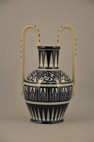 MALICORNE. VASE-AMPHORE en grès émaillé à décor tournant de motifs géométriques stylisés dans des réserves. Col resserré. Anses hautes. Bordure et talon "Bleu de Sèvres". Cachet rond en creux: "grès [...] Malicorne". Dans le goût indo-persan. XXème. Haut. 42 cm.