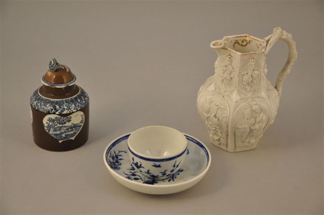 VARIA. LOT comprenant un PICHET en porcelaine biscuit à pans coupés. Le corps est orné d'un décor chinoisant, dans des réserves, et des bouquets de fleurs sont disposés sous le col. Traces de dorure. Marque imprimée en bleu: "JP". XIXème. Haut. 15 cm.