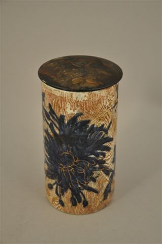 VARIA. POT cylindrique à décor botanique. Couvercle en bois à décor japonisant. Haut. 13,5 cm.