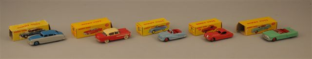DINKY TOYS England. 1/43ème. LOT 5 unités comprenant: une voiture Packard Convertible, dans sa boîte en l'état. (manque le chauffeur). Une voiture Austin Atlantic Convertible, dans sa boîte en l'état. Une voiture Jaguar XK120 Coupé, dans sa boîte en l'état. Une voiture Hudson Hornet Sedan avec fenêtres, dans sa boîte en l'état. Une voiture Hudson Commodore Sedan, dans sa boîte en l'état.