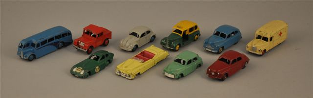 DINKY TOYS England. 1/43ème. LOT 10 unités comprenant: un taxi anglais Austin avec chauffeur. Une voiture Volkswagen Coccinelle Ovale. Une voiture de police Mersey Tunnel. Une voiture Vanguard. Une ambulance Daimler. Une voiture Hillman Minx, sans roues. Une voiture Rover 75. Un autobus anglais. Une voiture de course Bristol 450 (sans pneus). Une voiture Cadillac Eldorado (manque les deux pneus avant). (sans boîtes)