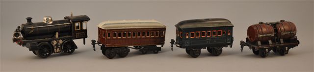 GLEICH und WECHSELSTROM. Echelle O. Ensemble comprenant une locomotive type vapeur, un wagon double foudre, un wagon voyageurs voiture restaurant Cie des Wagons lits et Grands Express Européens, un wagon voyageurs "1884". (manques)