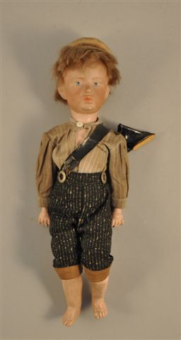 K et R. POUPÉE représentant un écolier, tête en biscuit moulé, yeux peints, marquée K et R 107 30, corps et membres articulés en composition. Haut. 31 cm.