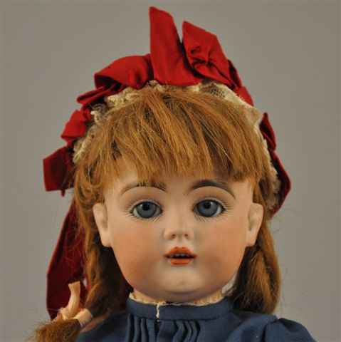 POUPÉE, tête en biscuit moulé pressé, yeux bleus mobiles en verre, bouche ouverte avec dents, marquée Made in Germany E 9, cheveux naturels, corps et membres articulés en composition. Vêtue d'un haut de corsage et d'une jupe en tissu bleu, d'un chapeau en toile de coton blanc et ruban rouge. Haut. 41 cm. (accident à un doigt)