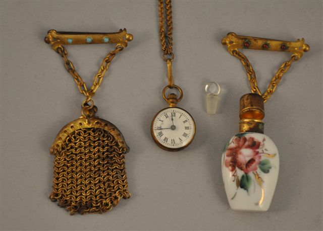 ACCESSOIRES de poupée comprenant la pharmacie particulière à l'usage des poupées, un coffret à bijoux, une montre de gousset, une broche ornée d'une pierre blanche, un éventail en bois, une vinaigrette en porcelaine, un porte-plume et un porte-monnaie en maille dorée.