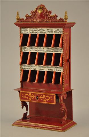 POSTE DE TRIAGE DES BILLETS DE TRAINS à un tiroir et quinze cases, en tôle laqué rouge, piètements en console reposant sur une base quadrangulaire, décor or de rinceaux fleuris, Maison OCH FRÈRES, 2 et 4 rue du Marché à Genève. Haut. 27, Long. 12,5, Prof. 7,5 cm. (accident une console).