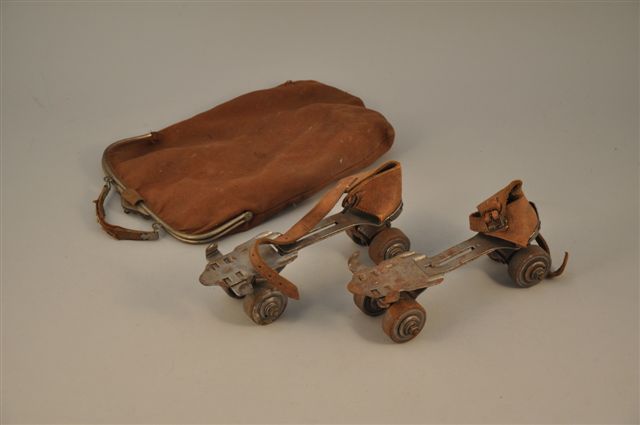 Paire de PATINS à ROULETTES anciens, dans un sac en tissu.