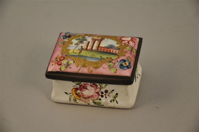 BOÎTE rectangulaire en émail, le corps à profil concave, à décor polychrome de fleurs, le couvercle à charnière à fond rose à décor, dans une réserve à entourage rocaille doré, d'un paysage à l'antique animé d'un personnage, fleurs aux angles. Monture en laiton. XIXème. Haut. 3, Long. 5, Larg. 4 cm. (fêles)