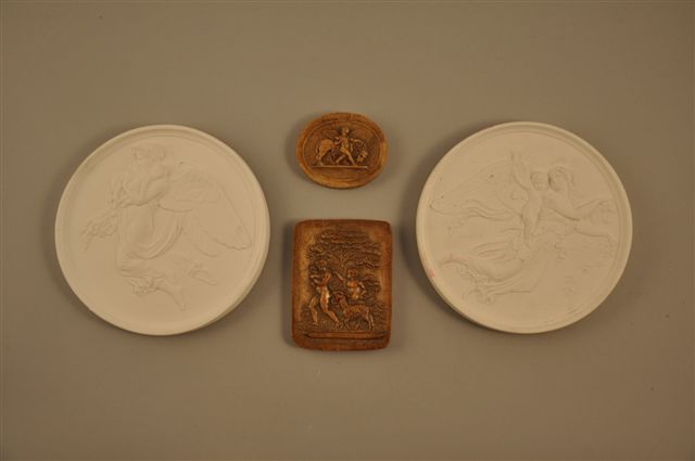 LOT comprenant QUATRE BAS RELIEFS, en plâtre: deux formant pendants représentant des femmes ailés et des putti (Diam. 14,5 cm). Le troisième, rectangulaire, en plâtre patiné, représentant des enfants à la cueillette (9 x 6,5 cm). Le quatrième ovale, en plâtre patiné, représentant un cupidon au lion (5 x 6 cm).