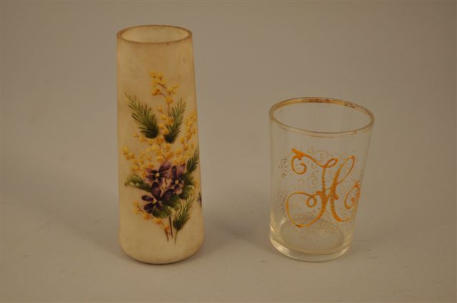VERRE de BAPTÊME émaillé d'un "H", Haut. 7,5 cm (éclats) et un VASE SOLIFLORE en verre opalin à décor peint de violettes et de mimosas. Marqué "Valence". Haut. 12 cm.
