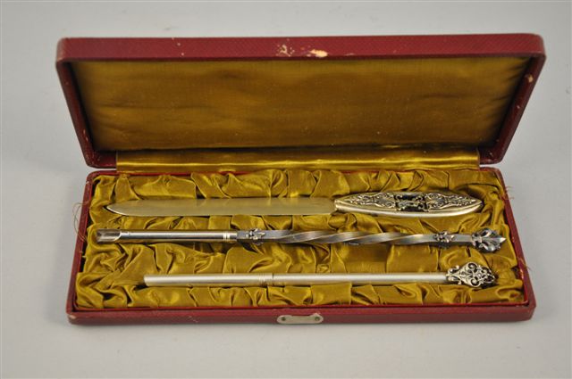 NÉCESSAIRE DE BUREAU en métal argenté comprenant deux PORTES-PLUMES et un COUPE-PAPIER, décor de fleur de lys et de rinceaux. Dans un écrin.