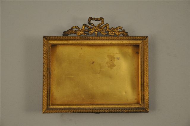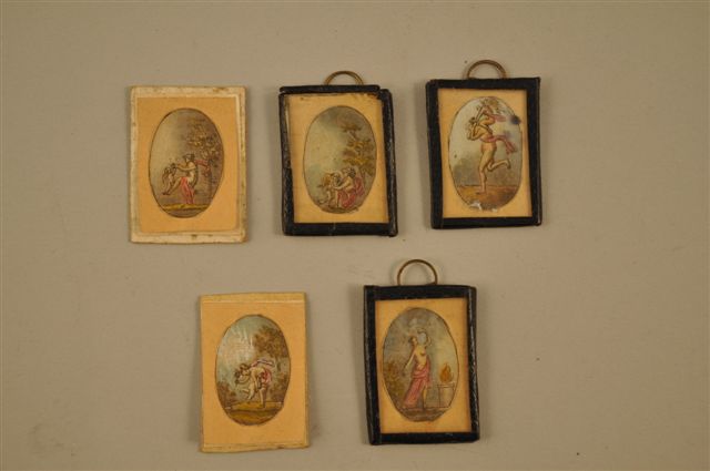 LOT de BIBELOTS comprenant une boîte ronde, deux porte-photos dont un en métal doré de style Louis XVI, deux petits miroirs, cinq vignettes aquarellées représentant les jeux de l'Amour et de l'Hymen (trois encadrées), un service à thé-café miniature en porcelaine dorée (accidents).