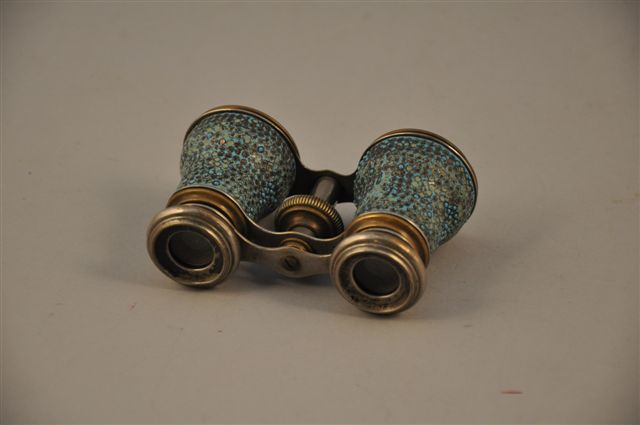 Paire de JUMELLES de théâtre, habillage en métal émaillé turquoise, en relief (petit accident et manques à l'émail)