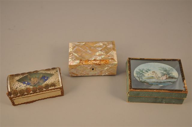 LOT comprenant QUATRE BOITES. La première en placage de nacre et ivoire, couvercle à pans, intérieur en satin bleu, Haut. 5,5, Long. 12,5, Larg. 8 cm (accidents et manques).