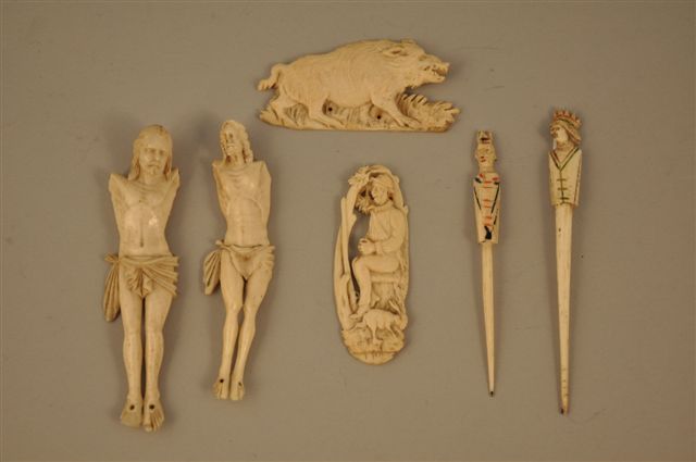 LOT de six objets en ivoire comprenant: un CHASSEUR à l'affût un lièvre à ses pieds 8,5 x 3 cm,deux CORPS de CHRIST sans bras 11,5 x 2,5 et 10,5 x 2,5 cm, un SANGLIER, 4 x 8 cm, deux PIQUES sculptées et peintes de bustes de rois, Long. 12 et 10 cm.
