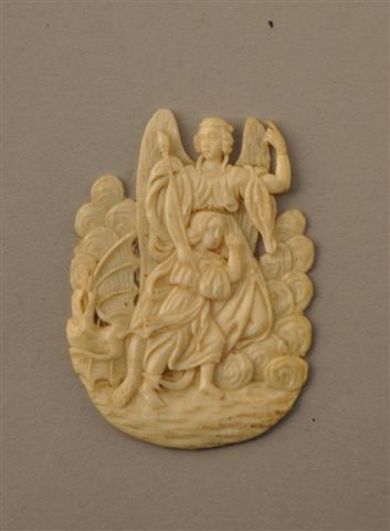 IVOIRE sculpté en bas relief représentant deux personnages, l'un ailé protégeant un enfant, Saint Georges (?) terrassant le dragon. Haut. 5, larg. 3,5 cm.