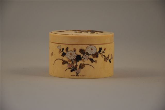 BOÎTE RONDE en ivoire et incrustations de nacre et d'écaille de tortue. Décor tournant d'oiseaux, chrysanthèmes, de glycines et papillons. A l'intérieur, décor de papillons en nacre. Porte au revers une signature dans un cachet ovale en nacre.