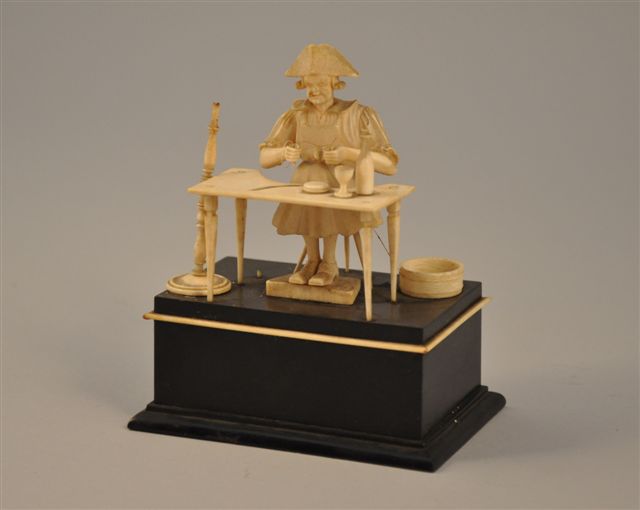GROUPE en ivoire finement sculpté représentant un cordonnier au tricorne, assis, à sa table de travail. Socle quadrangulaire en bois noirci. Porte l'étaiquette de la maison BOHLER à Francfort. Travail Dieppois (?). XIXème. Haut. 11, Long. 9,5, Larg. 6,5 cm.