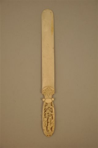 COUPE-PAPIER en ivoire le manche sculpté en haut relief de personnages. Canton. XIXème. Long. 25 cm