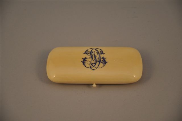 NÉCESSAIRE DE COUTURE en ivoire monogrammé "L.D.", renfermant un dé, un étui à aiguilles, une paire de ciseaux, un poinçon et un passe-lien, en or ou montés en or. XIXème siècle. Poids brut des pièces pesables: 21 g. (petits accidents aux ciseaux)
