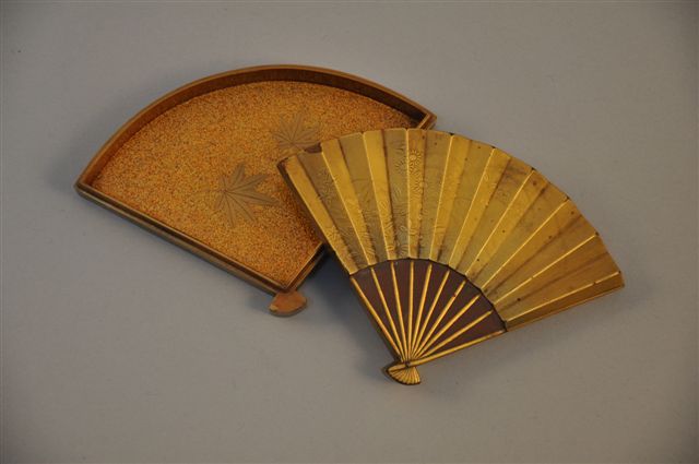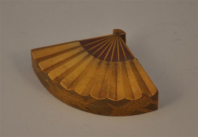 BOÎTE "ÉVENTAIL" en laque or, représentant un éventail plié à feuille à décor floral en relief. Motifs sur la tranche. Intérieur à décor de cinq feuilles sur pailleté or. JAPON. XIXème. Haut. 2, Long. 10, Larg. 7 cm. (deux petits éclats, petite fente au couvercle)