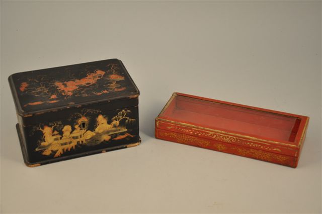BOITE rectangulaire en bois laqué rouge, à décor peint de motifs or, couvercle vitré. Haut. 4,5, Long. 26, Larg. 10,5 cm (manque)