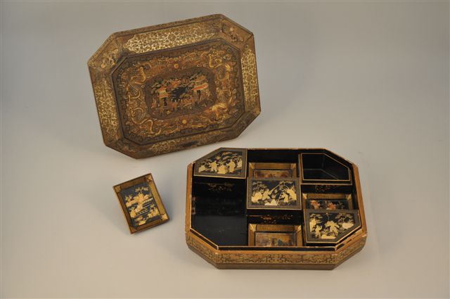 COFFRET rectangulaire pans en laque, décor en laque or de plusieurs tons, en ceinture de douze scènes dans des réserves, représentant des animaux et des fleurs stylisées, encadrements géométrisants. Le couvercle à profil en doucine à décor feuillagé et de paysages animés aux angles. Le dessus à décor centrale d'une scène de cour encadrée de quatre dragons. L'intérieur contient quatre boites couvertes dont trois d'angles et une centrale, et quatre coupelles rectangulaires. les couvercles et les coupelles à décor en laque or de scènes animées: enfants, chasseurs... dans des paysages. JAPON. XIXème. Haut. 11, Long. 38, Larg. 30 cm. (fentes et accidents, manque un couvercle et une boite d'angle, manque à un couvercle)