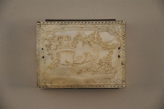 BOÎTE rectangulaire en nacre, couvercle à charnière. Décor en bas relief et finement gravé, sur le couvercle, dans un cartouche mouvementé, d'un couple d'oiseaux sur un carquois de flèches, symbolisant le serment d'amour. Le corps gravé toutes faces d'oiseaux dans un paysage lacustre. Monture en argent. Début XIXème.