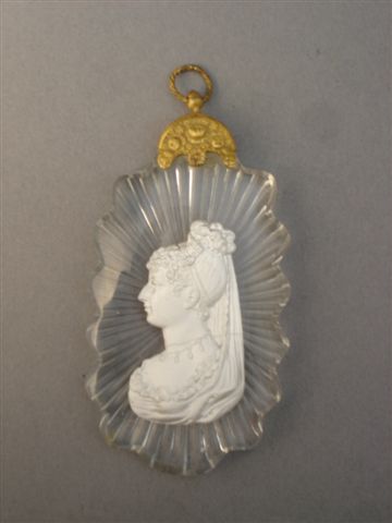 CRISTALLO-CÉRAME de forme chantournée représentant de profil le buste de la duchesse d'Angoulême. Avec une attache en bronze doré à décor de fleurettes.