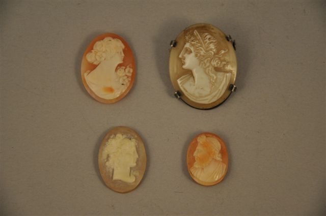 Quatre CAMÉES coquillage ovales. Trois profils de jeune femme et un profil d'homme. L'un monté en broche. Dim. 18 x 14, 23 X 17, 25 x 19 et 3 x 24 mm.