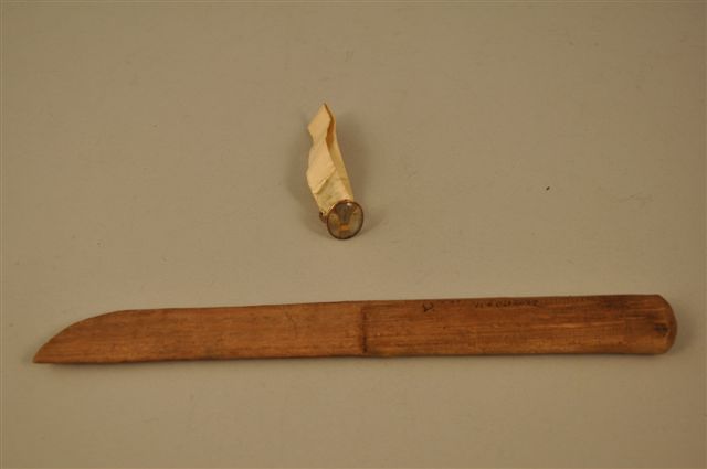 SOUVENIR DE LA FAMILLE D'IMÉCOURT comprenant un COUTEAU en bois sculpté, marqué à l'encre sur le manche "Vctesse d'Imécourt", une BAGUE en or sertie sous verre de cheveux du Vicomte d'Imécourt.