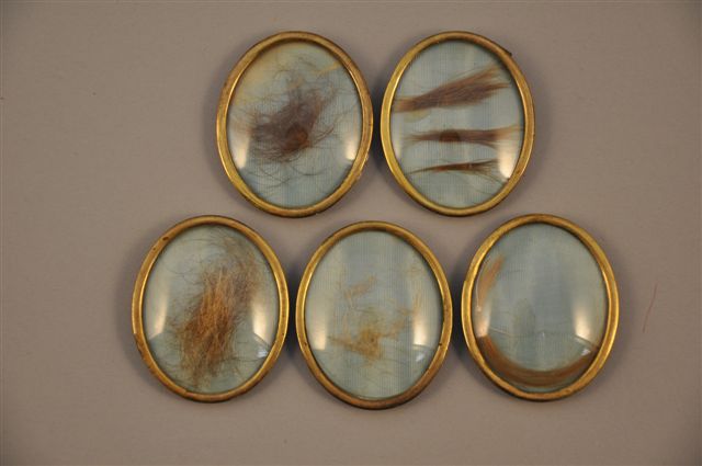 ENSEMBLE de cinq MÉDAILLONS ovale en laiton contenant des reliques de la famille royale dont: cheveux de Louis XVI avec au dos une inscription manuscrite: "cheveux de Louis XVI coupés pendant la journée qu'il a passé à l'Assemblée nationale le (...) recueillis par la Duchesse de Tourzel qui était avec lui". Cheveux de Charles X, cheveux de Mademoiselle avec inscription manuscrite au dos "1829", cheveux du Duc de Bordeaux, cheveux de Madame La Dauphine.