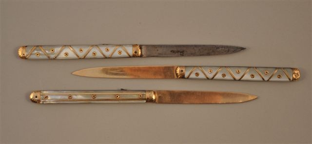 LOT comprenant: trois couteaux à lames pliantes, dont deux en or et un en métal, les manches en nacre ornée de fleurettes et filets d'or. XVIIIème siècle. (Accidents et manques aux manches)
